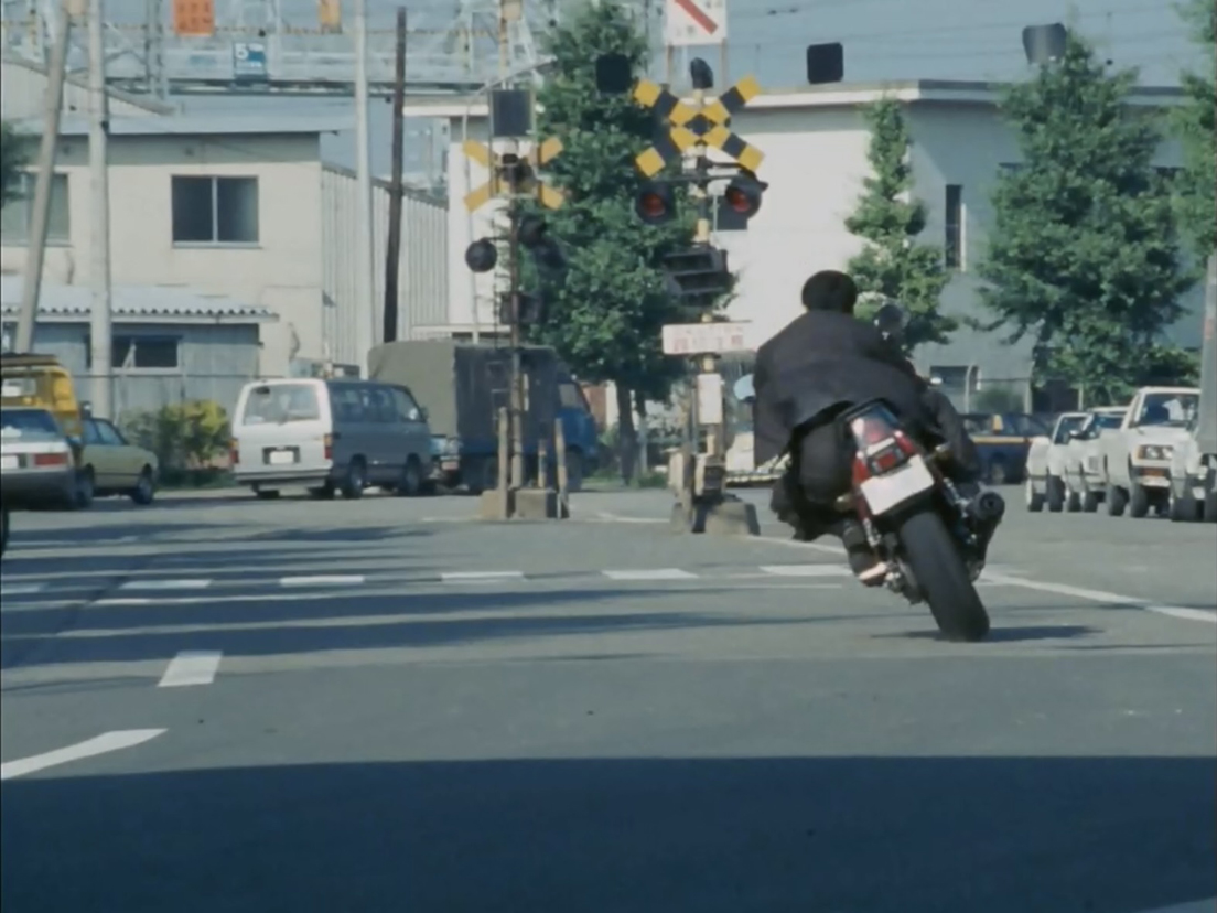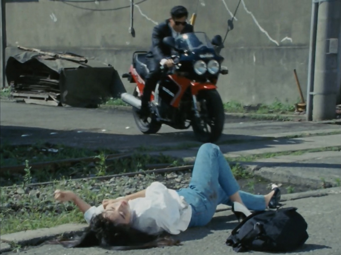 タカがバイクで由香を連れ去った車を追いかけます